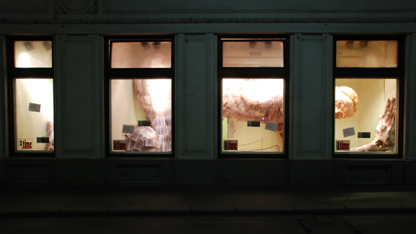 kann. Die Oberfläche der Skulptur ist der Straßenseite zugewandt - der Körperinnenraum ist nur zu sehen, wenn man das Gebäude der Galerie betritt und somit die architektonische Hülle passiert. Auf diese Weise werden in Martin Krammers Arbeit „fragile buildings“ die dominierenden raumbegrenzenden Schalen des Menschen subtil und auf innovative Art zueinander in Beziehung gesetzt. Das raumgreifende Maß von „fragile buildings“ entspricht der Intention des Künstlers und gelernten Architekten Krammer, dem es gefällt, den menschlichen Körper näher an seiner architektonischen Hülle verweilen zu lassen. Die Konzeption der Arbeit ermöglicht dem Betrachter eine mehrstufige Rezeption: 1) Ein Passant wird von der gegenüberliegenden Straßenseite aus eine voluminöse Figur wahrnehmen, die mehrere Innenwände im Hausinneren scheinbar durchdringt. 2) Unmittelbar vor den Fenstern der Galerie stehend, ist es dem Betrachter unmöglich, einen Blick aufs Ganze zu erheischen: Überraschungen durch das Spiel mit Erwartungshaltungen sind somit vorprogrammiert. 3) Betritt der Besucher die Galerieräume, so trifft er aus unmittelbarer Nähe auf den sequenzierten Innenraum der Skulptur, aufgeteilt über vier Räume der Galerie. „fragile buildings“ war als ein „work in progress“-Projekt angelegt: Von Beginn der Aufbauarbeiten an (10.11.2009) war die Skulptur öffentlich zugänglich und auch bei der Vernissage (14.11.2009) waren die Arbeiten nicht abgeschlossen. © Christian Hart, Martin Krammer |