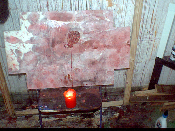 Leinwand auf Kreuzform aus Styropor, Dispersion, Wachs, rote Kerze brennend